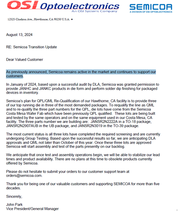 Devices as specified by Source Controlled Documents (SCD) are manufactured, screened and tested to customer requirements as specified in the SCD. The SCD product may be direct derivatives of existing MIL-PRF-19500 devices on which SEMICOA already holds qualification, or they may be custom designed devices. They may be a blend of our total device and package capabilities including die and packages that are not part of our standard Qualified Parts List (QPL) offering.