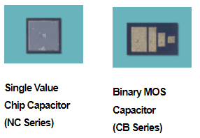 Vishay EFI wire bondable Metal Oxide Silicon (MOS) / Metal Nitride Oxide Silicon (MNOS) capacitors offer a small size, thin film option. Vishay EFI manufactures top contact single value thin film chip capacitors with silicon dioxide and silicon nitride dielectric on a silicon substrate. The top termination is available as either sputtered aluminum or plated gold and the backside metal is sputtered gold for mounting with conductive epoxy or some solders. EFI also produces binary MOS multi-value capacitor chips which allow the user many choices in value selection. Custom capacitor networks are another option, either by customer drawing or through collaboration